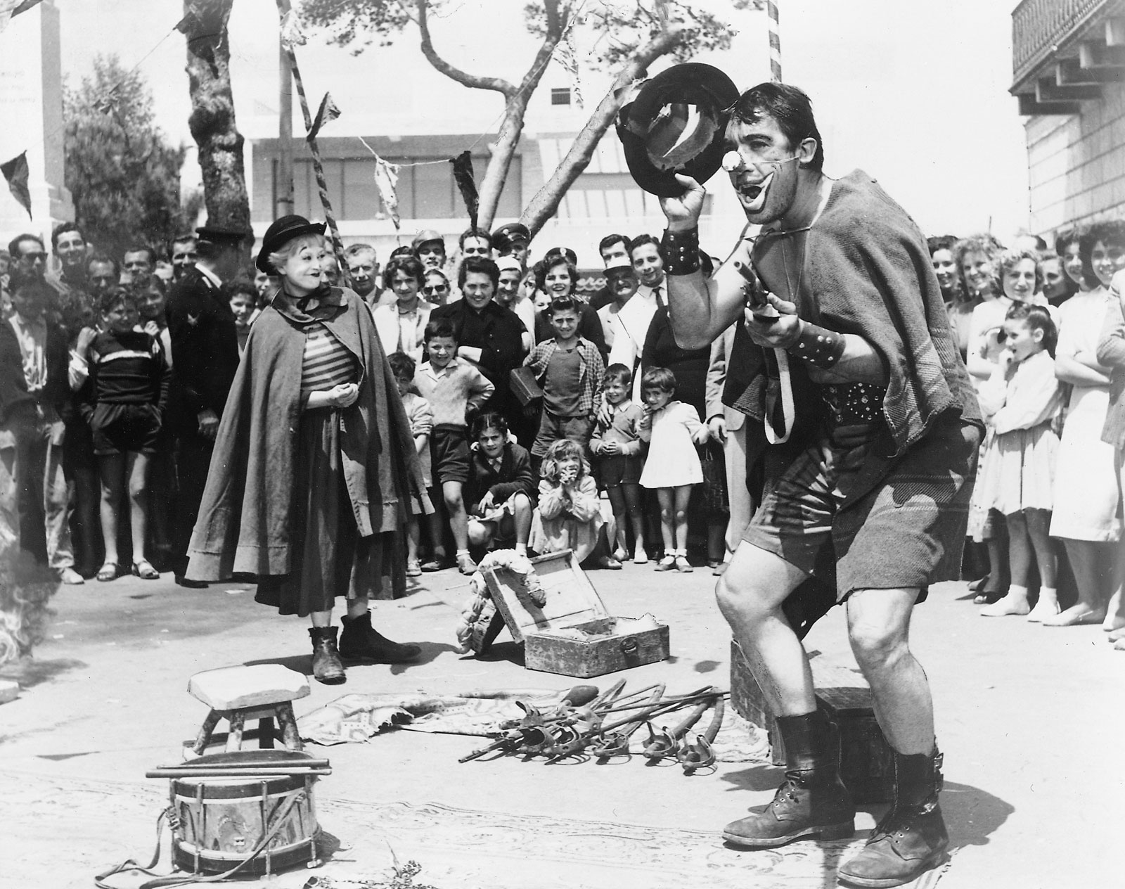Esta viagem que acompanhamos ao longo de anos (sim “A Estrada” é um “road movie”!) é a de Zampanò (Anthony Quinn), um homem rude e violento, egoísta e brutal. Anda de terra em terra a apresentar o seu “número” de circo, o do extraordinário homem que consegue apenas com os músculos do peito, rebentar os aros da corrente metálica que o envolve. Anda com uma “assistente”: anteriormente fora Rosa, mas morrera e ele começa, no início do filme, por dar a notícia à mãe e aos irmãos, a quem oferece 10.000 liras, e “requisita” uma outra filha, mais nova que Rosa, Gelsomina, uma rapariga ligeiramente atrasada, que fica entusiasmada com a ideia de viajar, de sempre “ser menos uma boca para alimentar”, como a mãe afirma, de cantar e dançar, de andar de feira em feira. Partem numa carroça escalavrada, puxada por uma moto que a tudo parece resistir. Andam pela paupérrima Itália do pós-guerra, feiras miseráveis, bairros degradados, praças desoladas e desconsolados circos. Zampanò não tem dúvidas quanto à forma como “amestrar” Gelsomina, ele que nunca falha “nem com cães”. Assim se faz, não sem um arrufo de rebeldia da parte de Gelsomina. Mas, como sempre em Fellini, um poeta e um sonhador, estas são personagens que perseguem sonhos e quimeras, quer sejam ternas atordoadas ou brutais contorcionistas de aço, ou mesmo loucos, como “Il Matto”, outra figura admirável, um equilibrista que sabe que vai morrer, mas não hesita em provocar o destino, quer seja num fio sobre uma praça, quer seja perante a ferocidade de Zampanò. No fundo, esta Humanidade frágil, por muita força que revele nos músculos, procura o amor e a cumplicidade de um gesto, de um olhar.